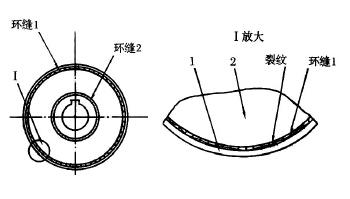筒體在制造和使用中最易出現(xiàn)的問題是環(huán)縫1、環(huán)縫2處產(chǎn)生裂紋(如圖2)。